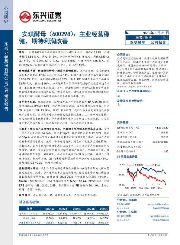 盈利预测与评级:我们认为国内酵母及酵母抽提物均在消费升级的过程中获得发展空间,此外,公司海外业务具备较大潜力,糖蜜成本带来的业绩波动性长期来看有望降低。预计公司2023-2025年营业收入分别为144.44、164.67、189.33亿元,归母净利润分别为14.59、18.44、22.53亿元,对应EPS分别为1.68、2.12、2.59。当前股价对应PE分别为20、16、13倍,维持“推荐”评级。