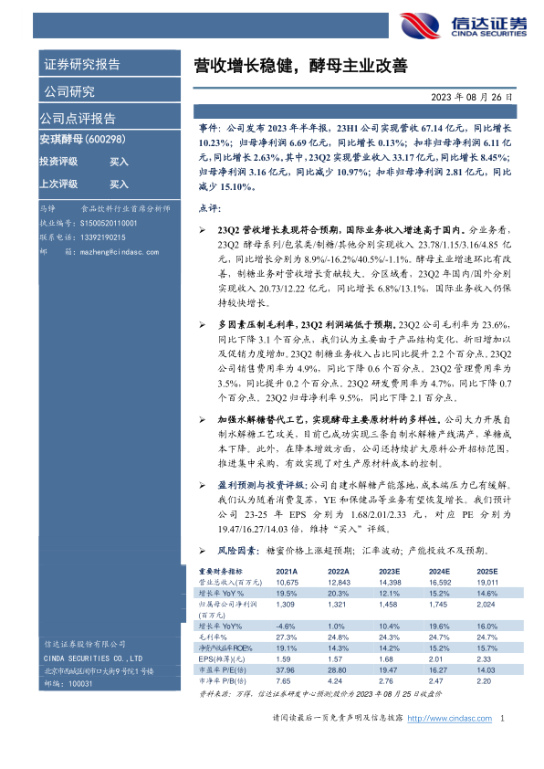安琪酵母在2023年上半年实现了营收的稳健增长,尤其国际业务表现亮眼。尽管第二季度受多重因素影响利润端有所承压,但公司通过成功实施自制水解糖工艺及优化采购策略,有效缓解了成本压力。展望未来,随着成本控制措施的持续显效和消费市场的逐步复苏,公司盈利能力有望改善,高附加值业务预计将恢复增长。因此,报告维持对安琪酵母的“买入”评级,并提示相关风险。