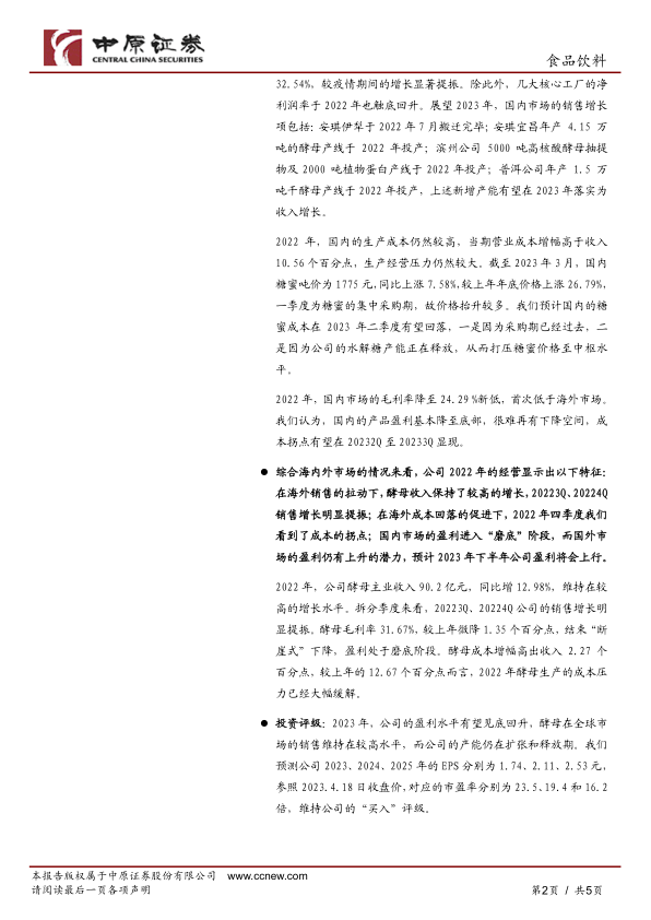 投资评级:2023年,公司的盈利水平有望见底回升,酵母在全球市场的销售维持在较高水平,而公司的产能仍在扩张和释放期。我们预测公司2023、2024、2025年的EPS分别为1.74、2.11、2.53元,参照2023.4.18日收盘价,对应的市盈率分别为23.5、19.4和16.2倍,维持公司的“买入”评级。
