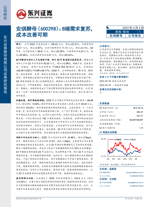 本报告的核心观点围绕安琪酵母(600298)的B端需求复苏和成本改善展开,具体包括: