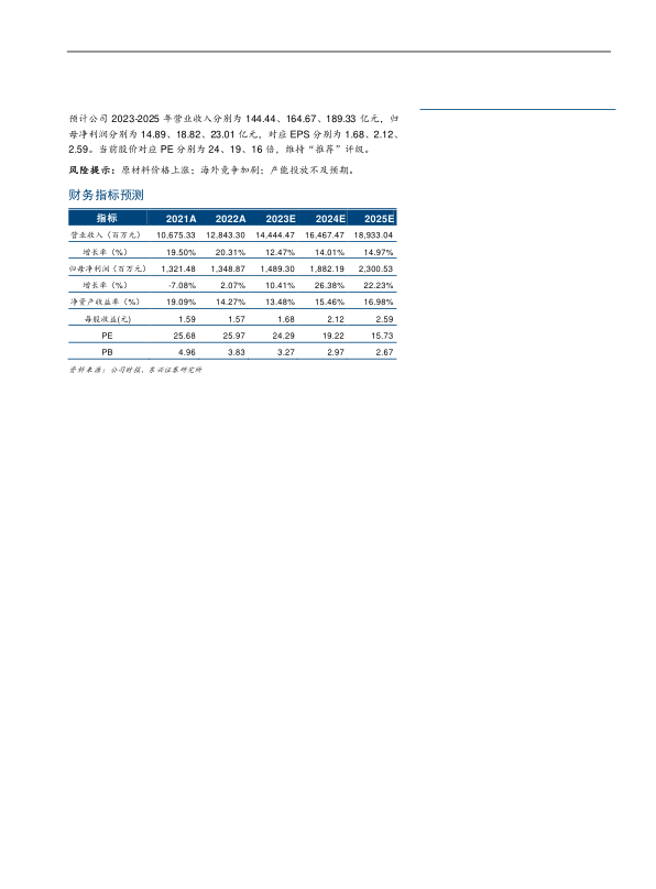 报告提示了以下风险:原材料价格上涨、海外竞争加剧、产能投放不及预期。