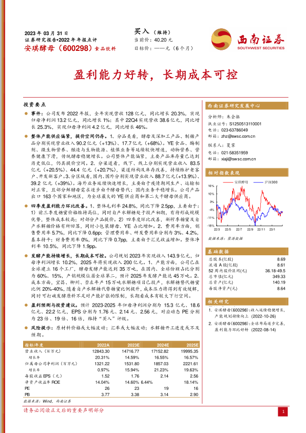 安琪酵母在2022年实现了营收的显著增长,全年营收达到128亿元,同比增长20.3%,其中第四季度营收增长尤为强劲,达到25.3%。尽管全年归母净利润增长1%,但第四季度归母净利润同比增长46%,显示出公司盈利能力在年末显著改善。这主要得益于产品结构优化、提价策略以及原材料成本压力的缓解。