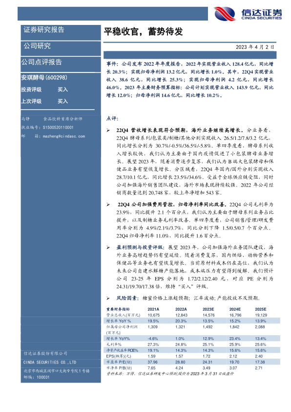 本报告对安琪酵母2022年业绩进行了回顾,并对公司未来发展前景进行了展望。公司海外业务持续高增长,国内业务有望复苏,盈利能力有望提升。维持“买入”评级,但同时也提示了相关风险因素。