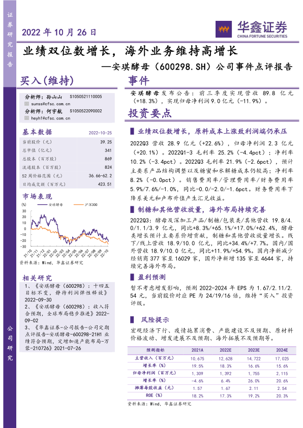 2022Q3 营收 28.9 亿元(+22.6%),归母净利润 2.3 亿元(+20.1%)。 2022Q1-3 毛利率 25.2%(-4.4pct);净利率10.2%(-3.4pct)。 2022Q3 毛利率 21.9%(-2.6pct), 预计主要系产品结构调整以及糖蜜和水解糖成本仍较高; 净利率8.2%( -0.0pct)。销售费用率/管理费用率/财务费用率5.9%/7.6%/-1.0%,同比-0.0/-2.0/-1.6pct。财务费用率下降系美元和卢布升值产生汇兑收益。