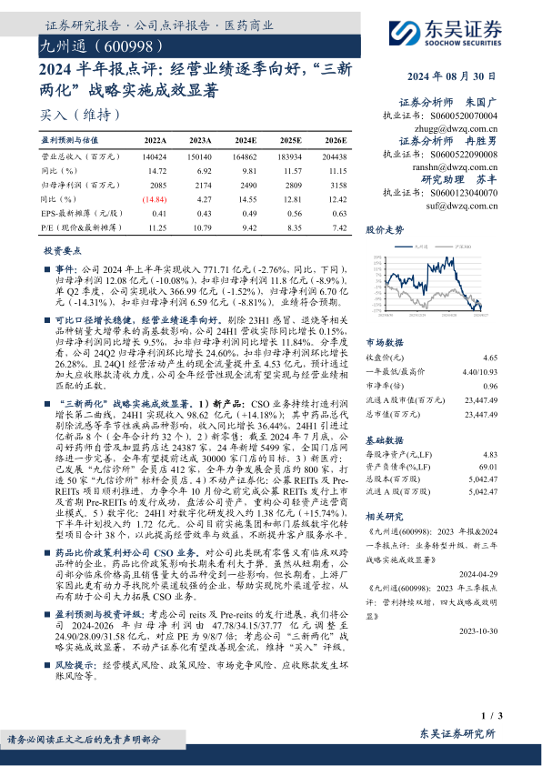 九州通2024年上半年业绩在剔除高基数影响后实现稳健增长,并呈现逐季向好的趋势。公司“三新两化”战略的深入实施取得了显著成效,特别是在CSO业务拓展、新零售门店网络完善、新医疗服务布局以及不动产证券化方面均有实质性进展。这些战略举措不仅优化了业务结构,也为公司未来的利润增长和现金流改善提供了有力支撑。尽管面临短期政策和市场挑战,但药品比价政策的长期影响被视为利好公司CSO业务。综合来看,公司通过战略转型和资产盘活,有望持续提升经营效率和市场竞争力,因此维持“买入”评级。