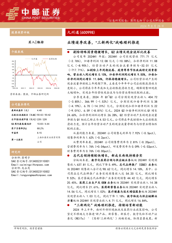 本报告对九州通(600998)2024年上半年的经营业绩进行了深入分析,指出公司在剔除特殊因素后实现了营收和归母净利润的稳健增长,特别是第二季度业绩和经营性现金流环比显著改善。报告强调了公司“三新两化”战略的顺利推进,包括总代总销业务的快速增长、新零售业务的门店扩张和销售额提升、新医疗业务的初步布局以及不动产证券化项目的稳步进展,这些都为公司培育了新的增长动能。基于对公司未来业绩的积极预测和当前估值水平,中邮证券维持“买入”评级,并提示了相关风险。整体而言,九州通展现出较强的经营韧性和战略执行力,未来发展潜力值得关注。