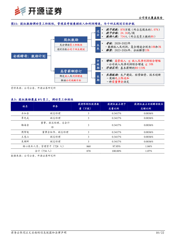 2021年5月,公司实施了股权激励计划,共授予878万股限制性股票,覆盖734名员工(约占总员工数量的8%)。该计划的考核目标兼顾收入(约10%复合增长)和利润(约3%复合增长)。此外,公司管理层薪酬考核与收入及净利润增速挂钩,确保了公司长期战略与短期目标的协同发展。