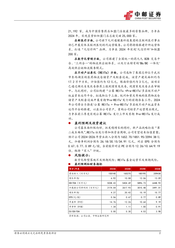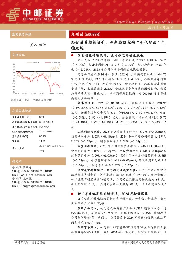 九州通(600998)在2023年展现出稳健的经营业绩和持续提升的经营质量,扣非净利润实现快速增长,经营活动现金流创历史新高,营运效率显著改善。公司积极推进“新三年战略”,在新产品、新零售、新医疗、数字化营销和不动产证券化等多个领域取得突破性进展,特别是新产品业务的强劲增长和REITs发行计划,有望为公司带来新的增长动力和估值重塑机会。尽管2024年第一季度业绩受高基数影响略有波动,但公司长期增长前景依然乐观。中邮证券维持对九州通的“买入”评级,并预测未来三年公司营收和归母净利润将持续增长,但投资者仍需关注数字化转型和REITs运营可能不及预期的风险。