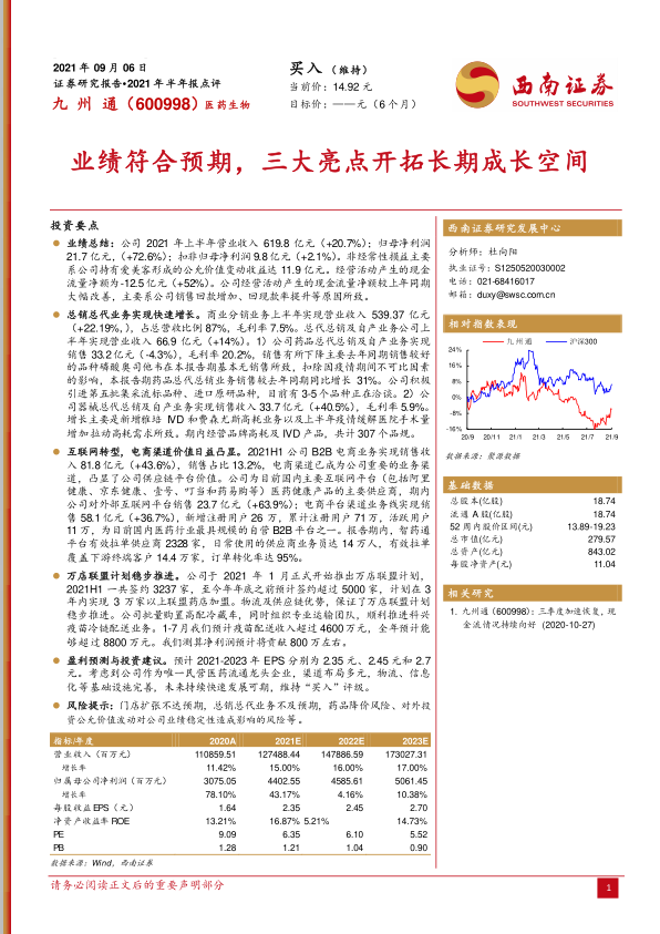 本报告对九州通(600998)2021年半年报进行了深入分析,核心观点如下: