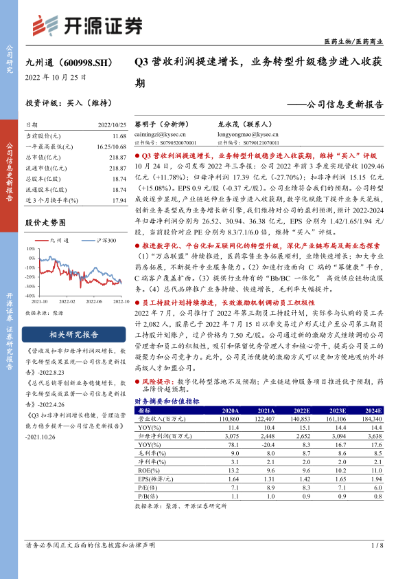 九州通在2022年第三季度展现出强劲的业绩增长势头,尤其在扣非净利润方面实现提速增长,表明其核心业务健康发展。公司积极推进的数字化、平台化和互联网化转型战略已初见成效,各项创新业务如“万店联盟”、C端“幂健康”平台、高效“Bb/BC一体化”供应链物流以及总代品牌推广业务均取得显著进展,成为公司未来业绩增长的重要驱动力。此外,员工持股计划的实施进一步完善了激励机制,有助于提升团队凝聚力和公司竞争力。尽管面临数字化转型、产业链延伸项目推进及药品降价等潜在风险,但公司凭借清晰的战略布局和持续的业务创新,有望保持稳健的盈利增长,因此维持“买入”评级。