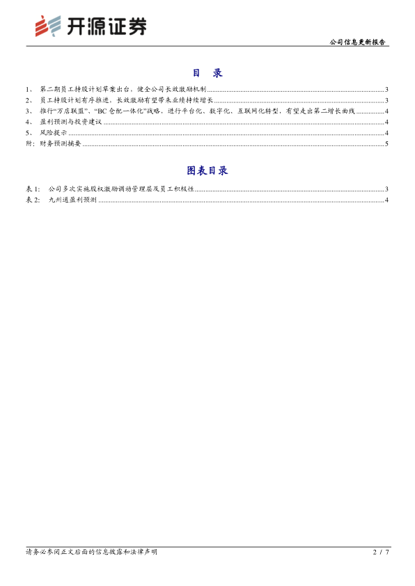 2021 年 8 月 2 日,公司公告了第二期员工持股计划草案:参加本期员工持股计划的对象预计不超过 2,000 人,包括董监高、公司中层管理人员、核心技术(业务)员工,实施规模不超过 1,600 万股,占总股本比例不超过 0.85%,授予价格9 元/股(截至 2021 年 8 月 3 日股价 14.39 元/股),存续期不超过 36 个月。 公司继 2020 年 7 月实施首期员工持股计划后,本次拟实施第二期员工持股计划,健全公司长效激励机制,充分调动公司管理者和员工的积极性,提高公司员工的凝聚力和公司竞争力。我们预计本次第二期持股计划对公司利润影响程度小。 公司为国内民营医药流通企业龙头,差异化布局院外市场,基于过往累积优势,持续推进平台化、数字化、互联网化转型,有望走出第二增长曲线。 我们维持2021-2023 年盈利预测, 预计 2021-2023 年归母净利润为 31.44/36.77/43.23 亿元,EPS 分别为 1.68/1.96/2.31 元/股,当前股价对应 P/E 为 8.6/7.3/6.2 倍,相比同类医药流通公司估值合理,维持“买入”评级。