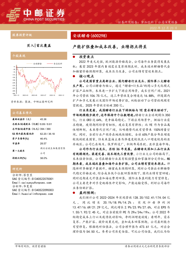 公司作为行业龙头,历经36年发展,在酵母及深加工品行业具有规模领先、渠道完善、技术领先三重优势,小行业大公司的格局下,未来强者恒强,公司在酵母行业具有较强壁垒和掌握部分定价权。短期来看,成本端改善叠加海外业务扩张,公司业绩有望迎来拐点。伴随新榨季糖蜜产量提升,糖蜜成本预期回落,同时公司推出水解糖替代稳定价格波动,综合成本低个位数回落预期下,国内业绩有望回暖;同时近期美元升值叠加海运费用回落,国际业务盈利能力有望修复。公司主要竞争对手受地缘性冲突影响,产能运输受限,利好公司海外业务份额扩张。
