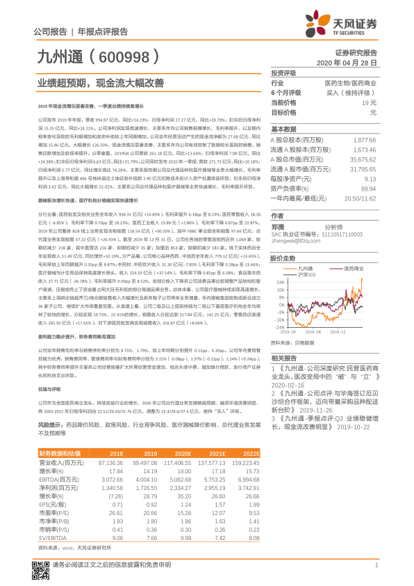 九州通2019年业绩表现强劲,盈利能力和现金流显著改善。公司在医药批发、零售、工业以及医疗器械等多个业务板块均有布局,并通过线上业务和总代理业务实现增长。同时,公司注重费用管控,盈利能力稳步提升。天风证券维持对公司“买入”评级,并上调了未来盈利预测,看好公司未来发展前景。