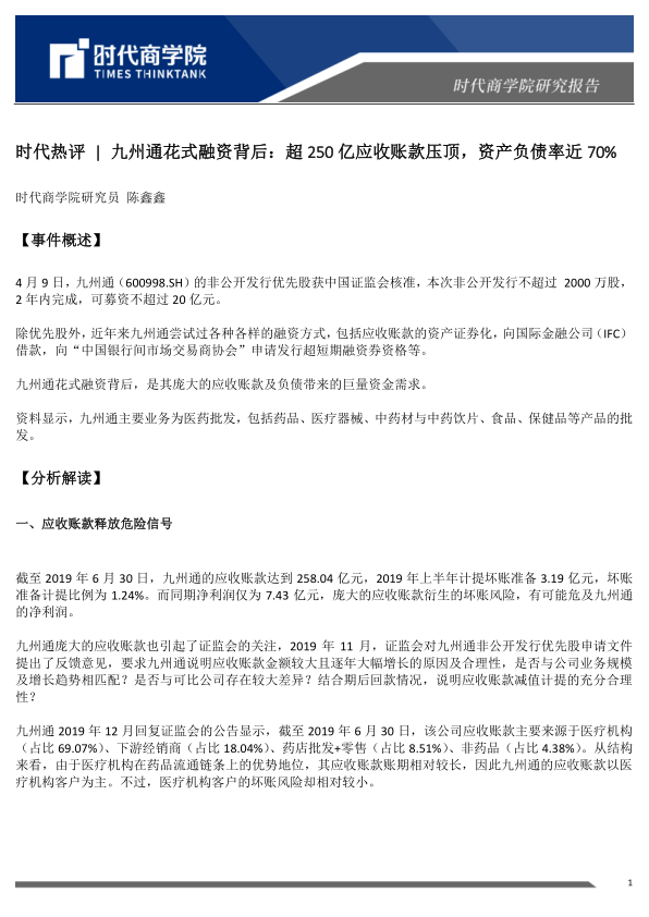 时代热评|九州通花式融资背后:超250亿应收账款压顶,资产负债率近70%
