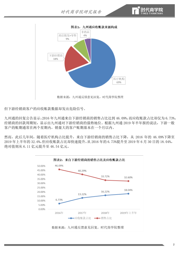 “两票制”的推行使得医药经销商经营状况恶化,付款能力变差,导致九州通来自下游经销商的应收账款坏账风险增加。