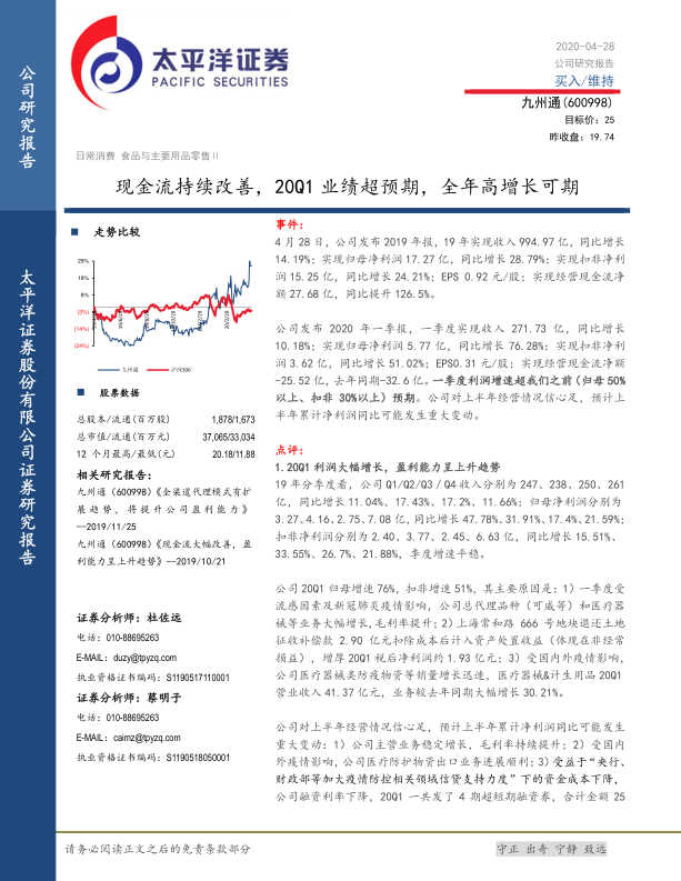 - 2019年年度业绩表现: 九州通在2019年实现营业收入994.97亿元,同比增长14.19%;归属于母公司股东的净利润达到17.27亿元,同比增长28.79%;扣除非经常性损益后的净利润为15.25亿元,同比增长24.21%。每股收益(EPS)为0.92元/股。值得注意的是,公司经营活动产生的现金流量净额为27.68亿元,同比大幅提升126.5%,显示出显著的现金流改善。