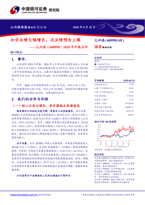 本报告的核心在于分析九州通(600998.SH)2020年中报,并对其未来发展提出投资建议。
