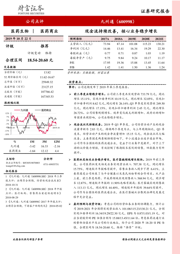 综合考虑公司的经营能力和各业务的协调发展,预计公司2019-2021年将分别实现营业收入101.08亿元、115.23亿元和130.21亿元。同期,归母净利润预计分别为16.34亿元、19.29亿元和22.30亿元,对应的每股收益(EPS)分别为0.87元、1.03元和1.19元。对应当前股价,2019-2021年的PE估值分别为15.88倍、13.45倍和11.64倍。鉴于医药流通行业的整体估值水平及九州通的行业地位,分析师给予公司2020年18-20倍PE估值,合理区间为18.54-20.60元,并维持“推荐”评级。