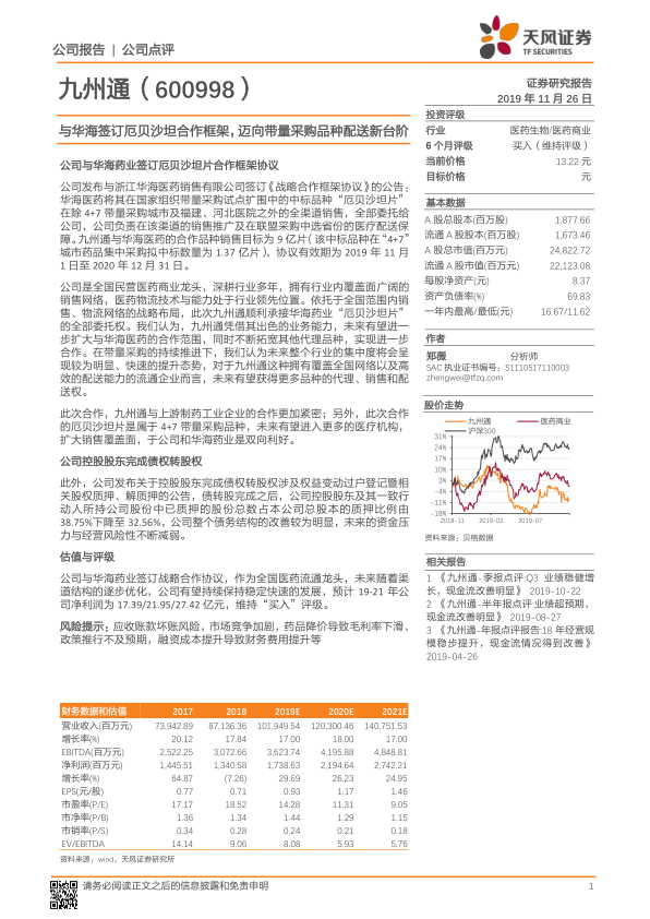 九州通与浙江华海医药销售有限公司签订《战略合作框架协议》,获得华海药业在国家组织带量采购试点扩围中中标品种“厄贝沙坦片”的独家销售推广及医疗配送保障权。具体合作范围涵盖除“4+7”带量采购城市及福建、河北医院之外的全渠道销售。此次合作的销售目标为9亿片,协议有效期至2020年12月31日。此项合作不仅加强了九州通与上游制药工业企业的紧密联系,也使得厄贝沙坦片这一带量采购品种有望进入更多医疗机构,显著扩大销售覆盖面,对双方均构成利好。
