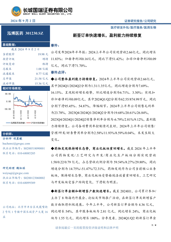 泓博医药在2024年上半年实现了营收的稳健增长和盈利能力的持续修复,尽管短期利润面临压力,但季度数据显示出积极的改善趋势。公司核心的药物发现业务保持增长,商业化板块在替格瑞洛放量带动下实现高速增长。在市场拓展方面,新签订单和新增客户数量均实现快速增长,为公司未来业绩增长奠定了坚实基础。此外,公司持续加大研发投入,并积极布局AI赋能的新药研发工具PR-GPT,有望进一步提升其在CRO/CDMO领域的竞争力。综合来看,泓博医药具备良好的发展潜力和市场拓展能力,维持“增持”评级。
