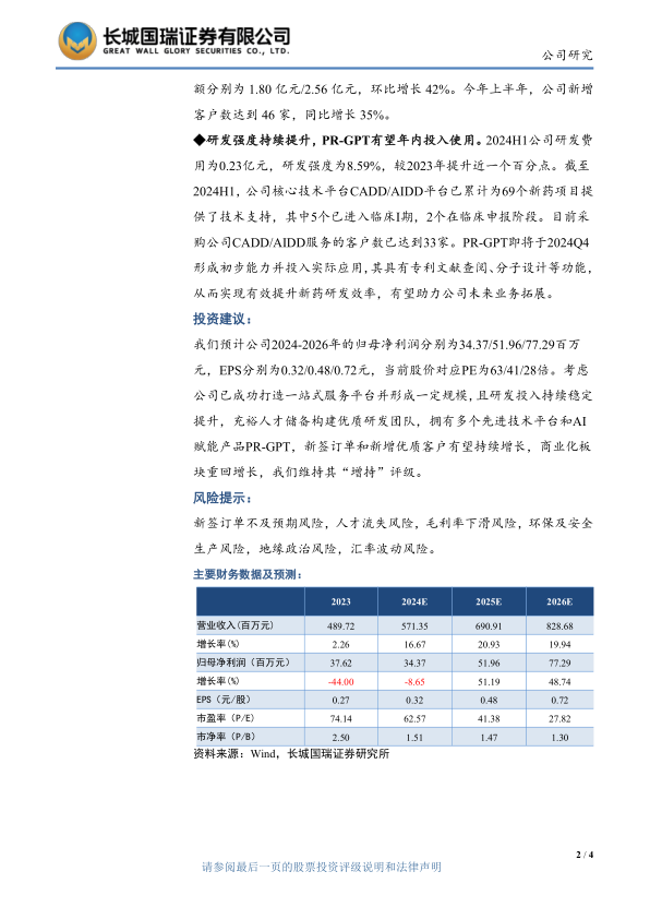 我们预计公司2024-2026年的归母净利润分别为34.37/51.96/77.29百万元,EPS分别为0.32/0.48/0.72元,当前股价对应PE为63/41/28倍。考虑公司已成功打造一站式服务平台并形成一定规模,且研发投入持续稳定提升,充裕人才储备构建优质研发团队,拥有多个先进技术平台和AI赋能产品PR-GPT,新签订单和新增优质客户有望持续增长,商业化板块重回增长,我们维持其“增持”评级。