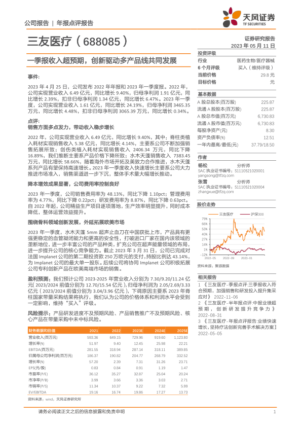 事件概述 2023年4月25日,三友医疗发布2022年年报和2023年一季报。