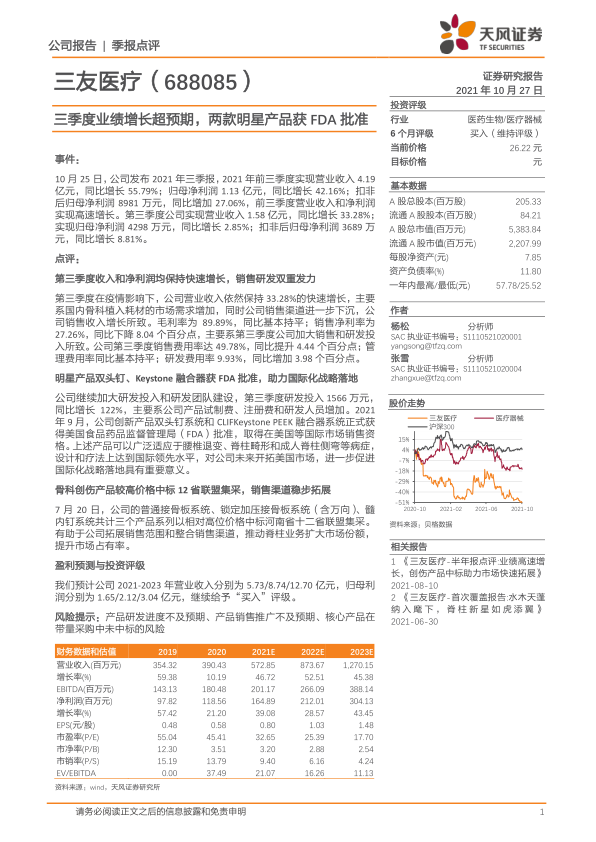 三友医疗三季度业绩超预期,收入和利润保持快速增长,销售和研发投入加大。明星产品获得FDA批准,为国际化战略奠定基础。骨科创伤产品在集采中以较高价格中标,有助于拓展销售渠道。维持“买入”评级,但需关注产品研发、销售推广以及集采未中标的风险。