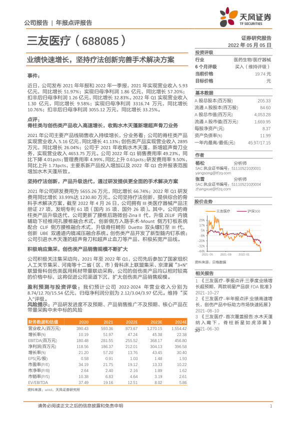 公司积极关注集采动向,2021年至2022年Q1,公司先后参加了国家组织人工关节集采、河南等十二省(区、市)骨科床上联盟集采、京津冀“3+N”联盟骨科创伤类医用耗材带量联动采购,公司的创伤类产品均以相对较高的价格中标,这将促进公司渠道下沉,扩大创伤类产品销售规模。