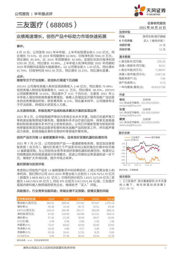 本报告对三友医疗(688085)2021年半年度报告进行了深入分析,核心观点如下: