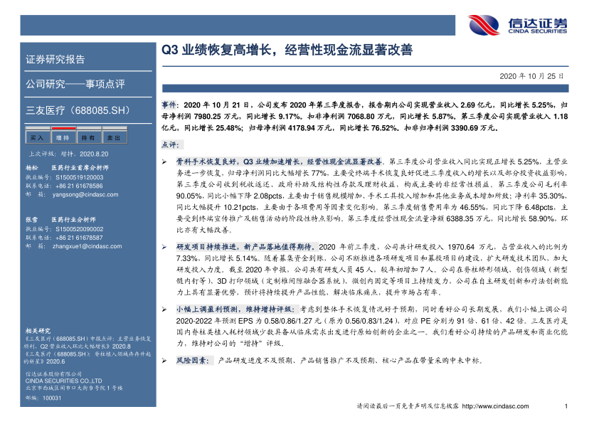 三友医疗在2020年第三季度展现出强劲的业绩复苏态势,营收和净利润实现高增长,经营性现金流显著改善,这主要得益于骨科手术的良好恢复以及公司有效的运营管理。公司持续加大研发投入,在多个创新领域取得进展,为未来增长奠定基础。分析师上调了盈利预测并维持“增持”评级,肯定了公司的创新能力和市场潜力,但同时也提醒投资者关注研发、销售推广以及带量采购等潜在风险。整体而言,报告对三友医疗的短期业绩表现和长期发展前景持积极态度。