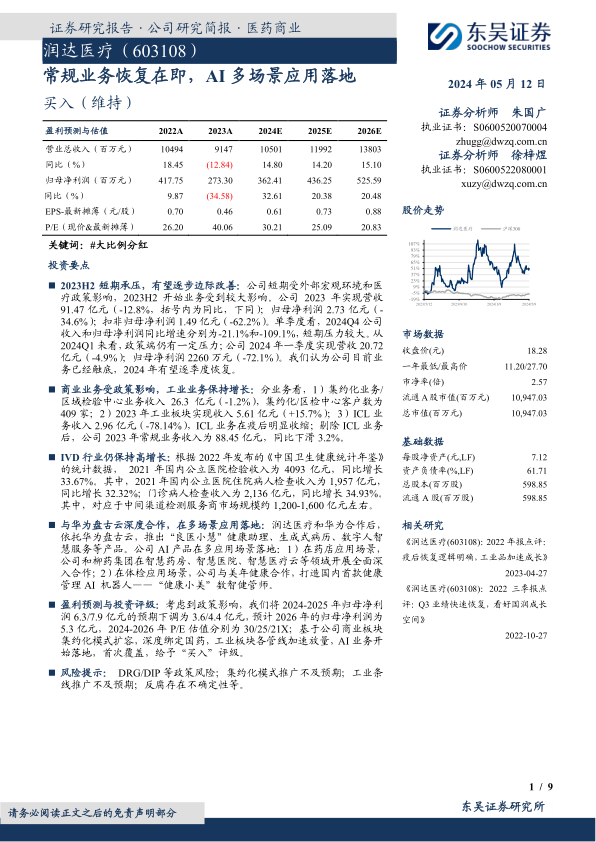 本报告分析了润达医疗的现状和未来发展前景。公司短期业绩受到政策影响,但长期来看,IVD行业仍保持高增长,且公司在AI领域的布局有望带来新的增长点。维持“买入”评级,但需关注政策风险、集约化模式推广、工业条线推广以及反腐等不确定因素。