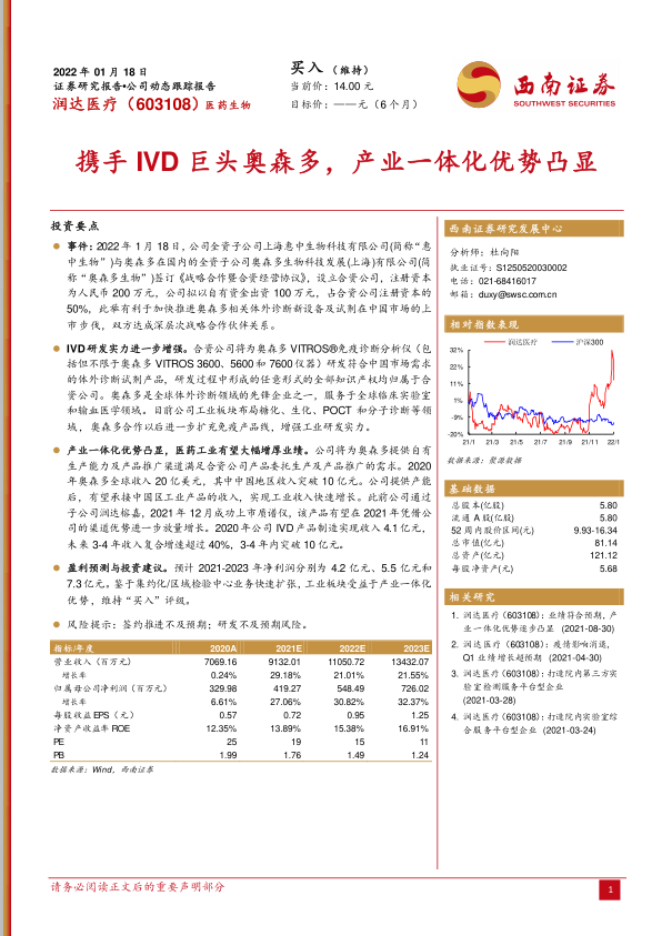 本报告的核心观点是润达医疗通过与IVD巨头奥森多的合作,有望在体外诊断领域实现更强的研发实力和产业一体化优势。具体来说: