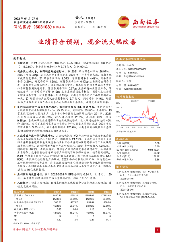 润达医疗2021年年报显示,公司业绩符合预期,现金流大幅改善。集约化/区域检验中心业务和新冠检测业务是公司增长的重要驱动力,工业板块受益于产业一体化也实现快速增长。公司持续加大研发投入,不断推出新产品。基于公司良好的发展态势和集约化业务的快速扩张,西南证券维持对润达医疗“买入”评级,但同时也提示了研发不及预期、集约化业务推进不及预期以及疫情反复波动等风险。