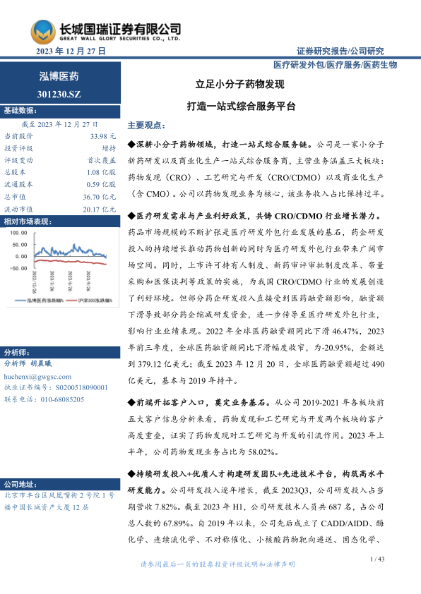 泓博医药立足小分子药物发现,打造一站式综合服务平台,提供从药物发现(CRO)、工艺研究与开发(CRO/CDMO)到商业化生产(含CMO)的全面服务。公司以药物发现为核心,并积极拓展业务,助力订单增长。