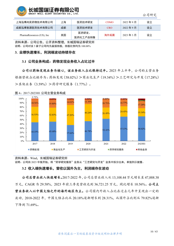 前端开拓客户入口,奠定业务基石。从公司2019-2021年各板块前五大客户信息分析来看,药物发现和工艺研究与开发两个板块的客户高度重叠,证实了药物发现对工艺研究与开发的引流作用。2023年上半年,公司药物发现业务占比为58.02%。