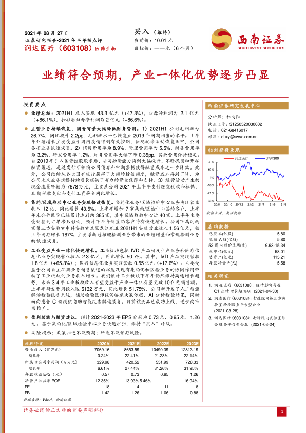 润达医疗在2021年上半年实现了显著的业绩增长,营业收入和归母净利润均大幅提升,主要得益于国内疫情后的业务强劲恢复。公司毛利率已恢复至疫情前水平,且国资背景的引入有效降低了财务费用,优化了资本结构。集约化/区域检验中心业务和工业板块均表现出色,前者通过扩大合作网络和第三方实验室业务实现快速扩张,后者则受益于自主品牌渠道拓展和业务协同效应,在IVD产品和医疗信息化领域实现高速增长,并持续加大研发投入,推出AI辅助诊断系统。分析师基于公司核心业务的快速扩张和产业一体化优势的逐步凸显,维持了“买入”评级,并预计未来几年盈利能力将持续增长。尽管存在政策和研发风险,但公司整体发展态势积极,未来增长潜力可期。