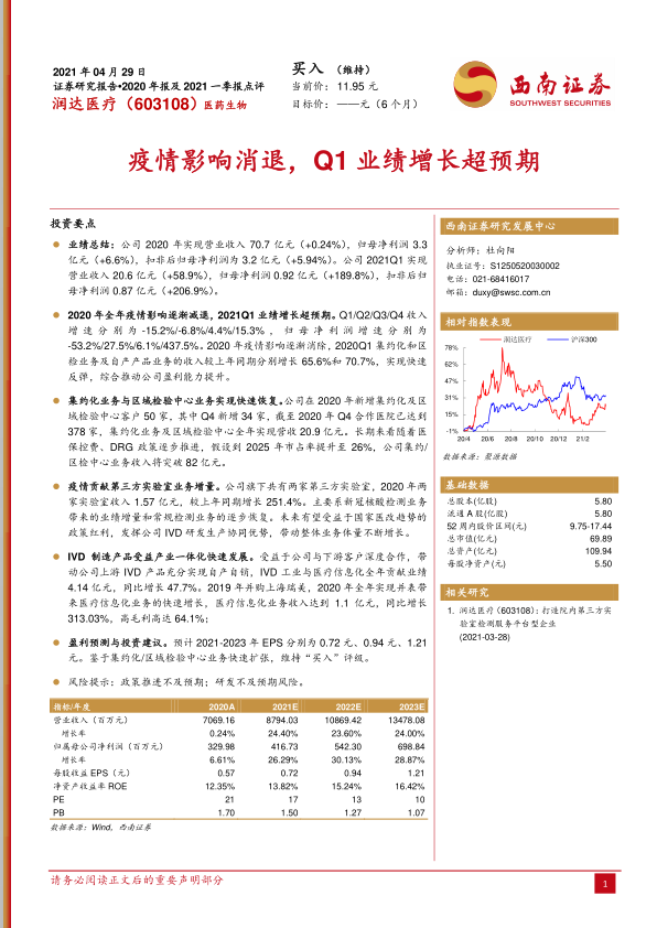 本报告对润达医疗的2020年报和2021年一季报进行了深入分析,认为公司业绩增长超预期,集约化业务是增长的主要驱动力,IVD制造协同效应显著。维持“买入”评级,但需注意政策推进和研发不及预期的风险。