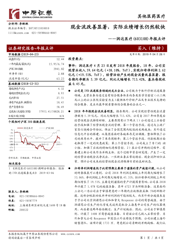 润达医疗在2018年展现出强劲的财务韧性,营业收入和归母净利润均实现较快增长,尤其经营活动现金流同比大幅增长713.42%,凸显了公司在精细化管理和运营效率提升方面的成效。尽管受审慎的资产减值计提影响,归母净利润增速有所放缓,但公司作为IVD流通服务领域的龙头企业,凭借其高附加值的集约服务模式,保持了健康的毛利率水平。展望未来,通过深化收购业务整合、提升信息化服务能力以及将自主研发产品纳入集约服务体系,公司有望持续实现业绩增长。鉴于其改善的现金流状况、高速增长的业绩以及在国内IVD企业中具有竞争力的低估值,报告维持润达医疗“买入”的投资评级,认为其具备较高的投资价值。同时,投资者应密切关注可转债项目进展、应收账款回收、集约业务推进及IVD产品价格变动等潜在风险。
