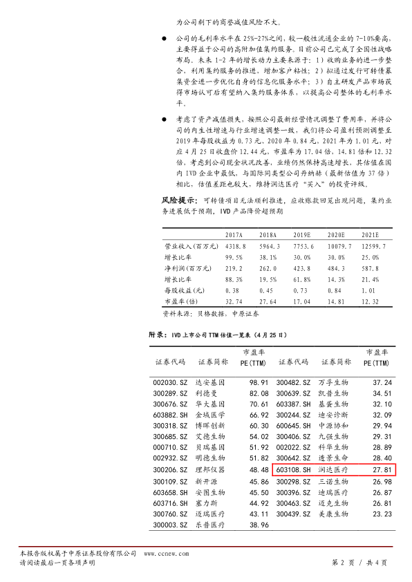 尽管2018年归母净利润增速因审慎的资产减值计提而低于预期,但公司凭借高附加值的集约服务模式,保持了良好的毛利率水平。未来,通过业务整合、信息化升级和自主研发产品纳入,公司具备持续增长的潜力。同时,其当前估值在国内IVD企业中处于较低水平,与国际同行相比亦有较大差距,凸显了其投资价值。