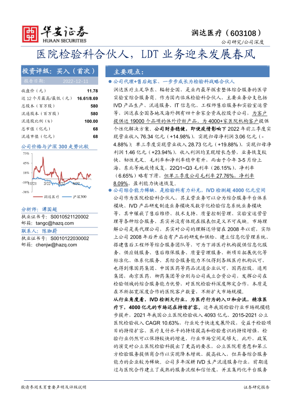 润达医疗是全国领先的检验科战略合作伙伴,通过多年深耕IVD供应链服务及实验室综合服务,具备系统化自主产品开发能力系统化的IT开发服务能力、完备的工程师服务团队体系,持续获得客户的认可。从商业板块看,在政策推动检验在院内发展的趋势下,公司有望乘春风,持续提高市占率,为公司绑定更多的医院;从工业板块看,公司纵深布局IVD产业链,未来有望持续扩充产品矩阵,打造第二增长曲线;从新政策看,LDT业务切入打开公司新的业务增长空间。未来公司的毛利率和净利率,随着更多自研产品的上市和LDT业务开展,将会持续稳健的提升,我们看好公司医院检验科战略合伙人的战略定位和稀缺的能力,预计2022~2024年公司将实现营业总收入102.28/123.42/146.83亿元人民币,同比+15.4%/20.7%/19.0%;实现归母净利润3.88/5.04/6.16亿元人民币,同比+2.1%/29.9%/22.2%;对应P/E17.59/13.54/11.08x。首次覆盖,给予“买入”评级。