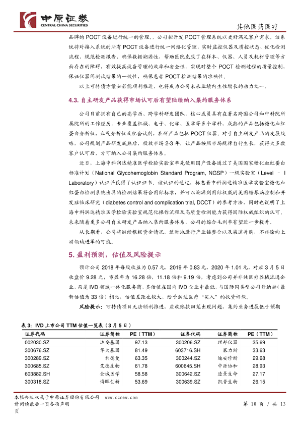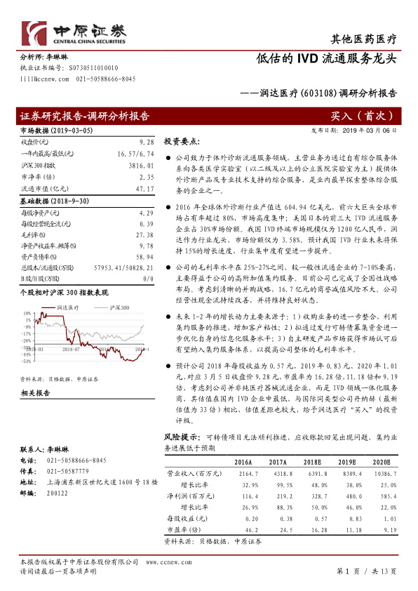 报告预计公司2018年、2019年和2020年每股收益分别为0.57元、0.83元和1.01元。对应2019年3月5日收盘价9.28元,市盈率分别为16.28倍、11.18倍和9.19倍。考虑到润达医疗作为IVD领域一体化服务商,其估值在国内IVD企业中处于最低水平(如表3所示,多数IVD上市公司PE TTM在20-90倍之间),且与国际同类型公司丹纳赫(最新估值33倍)相比,估值差距较大。因此,报告给予润达医疗“买入”的投资评级。