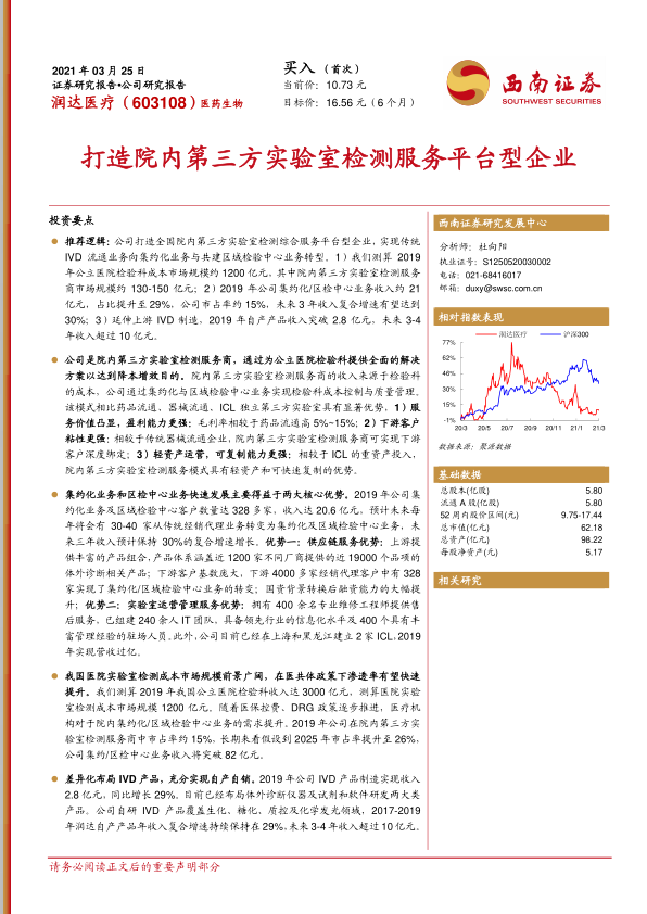 推荐逻辑:公司打造全国院内第三方实验室检测综合服务平台型企业,实现传统IVD流通业务向集约化业务与共建区域检验中心业务转型。1)我们测算2019年公立医院检验科成本市场规模约1200亿元,其中院内第三方实验室检测服务商市场规模约130-150亿元;2)2019年公司集约化/区检中心业务收入约21亿元,占比提升至29%,公司市占率约15%,未来3年收入复合增速有望达到30%;3)延伸上游IVD制造,2019年自产产品收入突破2.8亿元,未来3-4年收入超过10亿元。