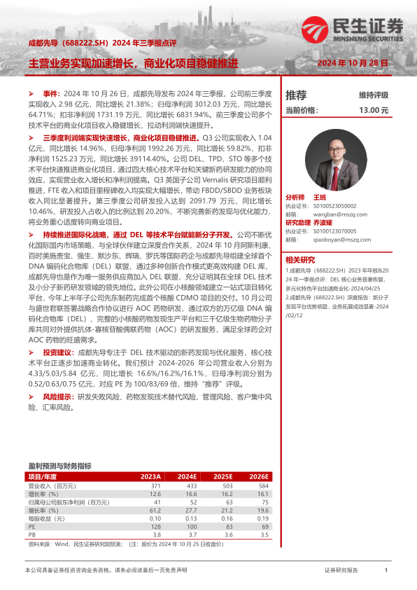 成都先导2024年三季报显示,公司主营业务实现加速增长,商业化项目稳健推进。公司通过DEL等核心技术平台赋能新分子开发,并积极拓展国际合作,巩固其在全球小分子新药研发领域的领先地位。维持“推荐”评级,但需关注相关风险。