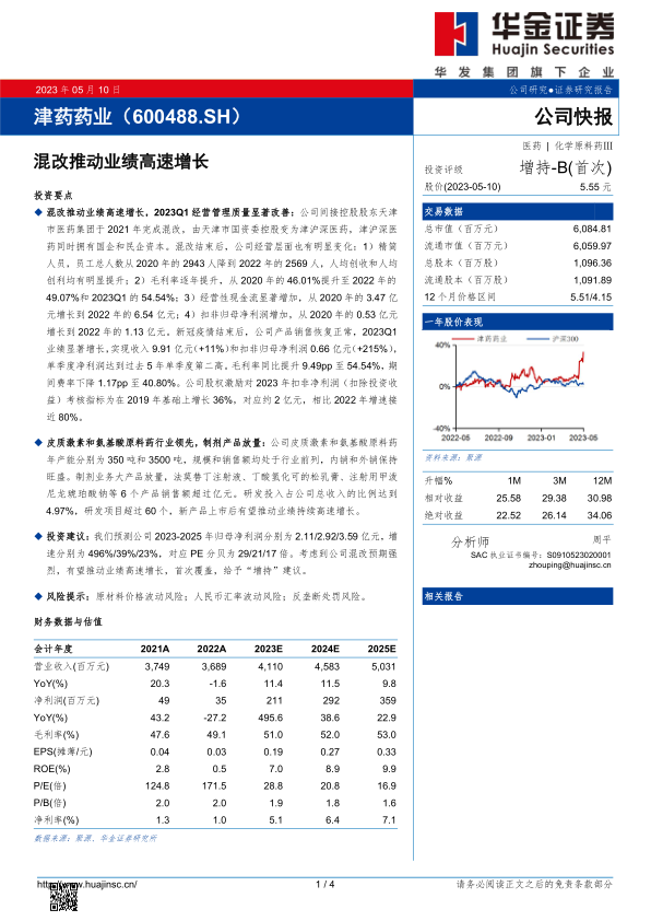 津药药业在2021年完成混改后,通过精简人员、提升经营效率,实现了显著的业绩增长和盈利能力改善。2023年第一季度,公司收入和扣非归母净利润均实现高速增长,毛利率和经营性现金流表现优异。公司在皮质激素和氨基酸原料药领域保持行业领先地位,制剂产品也实现规模放量,并持续加大研发投入以驱动未来增长。华金证券首次覆盖并给予“增持”评级,预测公司未来三年净利润将持续高速增长,估值吸引力逐步显现。然而,投资者仍需关注原材料价格波动、人民币汇率波动以及潜在的反垄断处罚等风险因素。