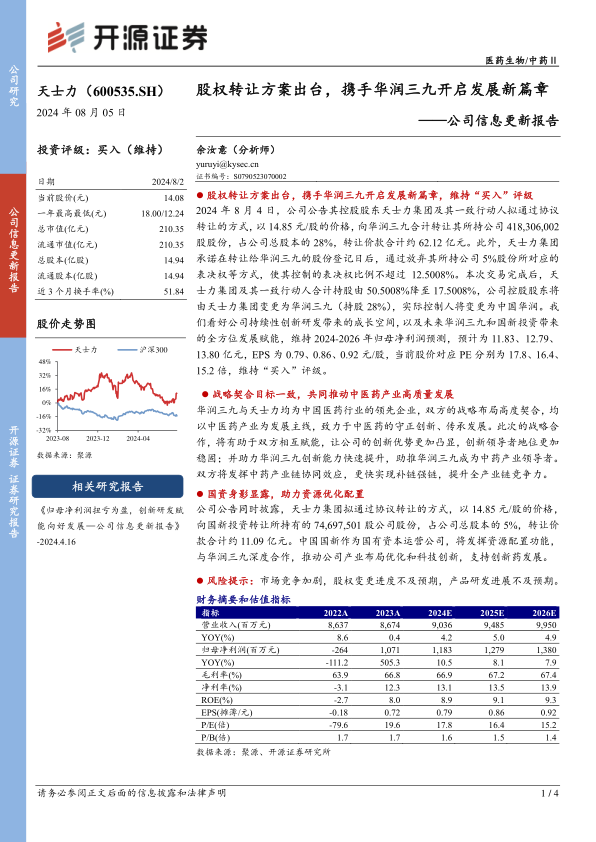 2024年8月4日,公司公告其控股股东天士力集团及其一致行动人拟通过协议转让的方式,以14.85元/股的价格,向华润三九合计转让其所持公司418,306,002股股份,占公司总股本的28%,转让价款合计约62.12亿元。此外,天士力集团承诺在转让给华润三九的股份登记日后,通过放弃其所持公司5%股份所对应的表决权等方式,使其控制的表决权比例不超过12.5008%。本次交易完成后,天士力集团及其一致行动人合计持股由50.5008%降至17.5008%,公司控股股东将由天士力集团变更为华润三九(持股28%),实际控制人将变更为中国华润。我们看好公司持续性创新研发带来的成长空间,以及未来华润三九和国新投资带来的全方位发展赋能,维持2024-2026年归母净利润预测,预计为11.83、12.79、13.80亿元,EPS为0.79、0.86、0.92元/股,当前股价对应PE分别为17.8、16.4、15.2倍,维持“买入”评级。