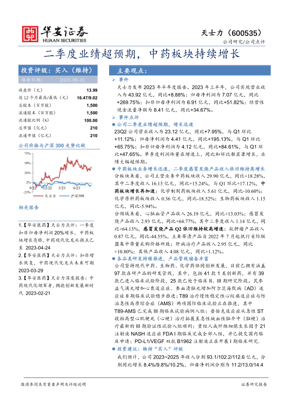 本报告对天士力2023年半年度业绩进行了全面分析,认为公司二季度业绩超预期,中药板块增长迅速,研发管线储备丰富,维持“买入”评级。公司未来发展值得期待。