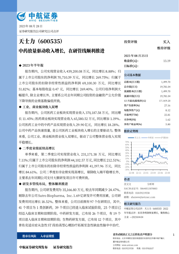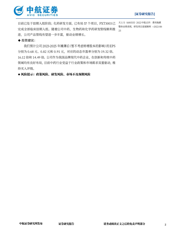 我们预计公司2023-2025年摊薄后(暂不考虑转增股本的影响)的EPS分别为0.68元、0.82元和0.91元,对应的动态市盈率分别为19.32倍、16.12倍和14.49倍。公司作为我国品牌现代中药企业,在创新和传统中药领域均有良好布局,目前中药行业受益于行业政策和市场需求双重驱动,维持买入评级。