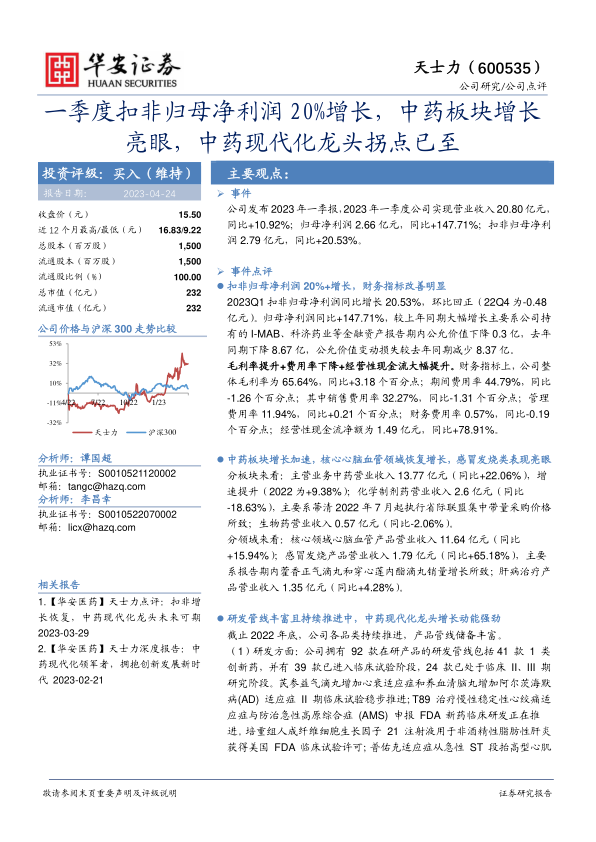 本报告对天士力(600535)2023年一季度业绩进行了分析,核心观点如下: