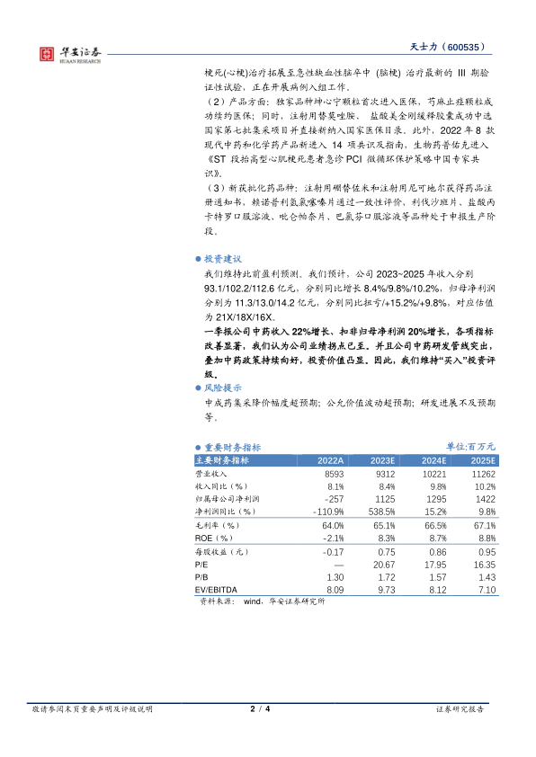 本报告通过对天士力2023年一季报的详细分析,认为公司业绩拐点已至,中药板块增长加速,研发管线丰富,维持“买入”投资评级。同时,报告也提示了中成药集采降价幅度超预期、公允价值波动超预期、研发进展不及预期等风险。