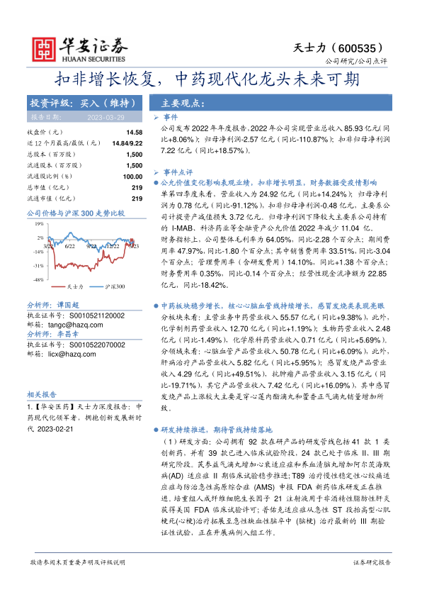 单第四季度来看,营业收入为24.92亿元(同比+14.24%);归母净利润为0.78亿元(同比-91.12%),扣非归母净利润-0.48亿元,主要系公司计提资产减值损失3.72亿元。归母净利润下降较大主要系公司持有的I-MAB、科济药业等金融资产公允价值2022年减少11.04亿。财务指标上,公司整体毛利率为64.05%,同比-2.28个百分点;期间费用率47.97%,同比-1.80个百分点;其中销售费用率33.51%,同比-3.04个百分点;管理费用率(含研发费用)14.10%,同比+1.38个百分点;财务费用率0.35%,同比-0.14个百分点;经营性现金流净额为22.85亿元,同比-18.42%。